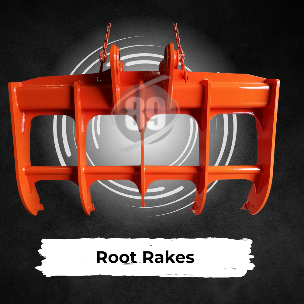 Clear land with confidence using our heavy-duty root rakes — engineered for land clearing, vegetation removal, and root extraction. Ideal for preparing job sites, farms, or forestry areas, these attachments are designed to grab, lift, and separate roots, stumps, and debris from the soil with minimal disturbance to the ground.